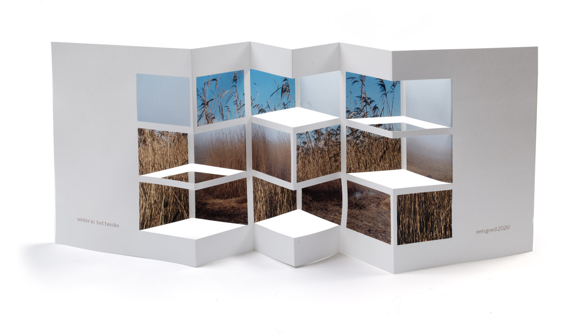 < > werknieuwjaarskaart 2026, twee foto's hebben in een ander perspectief een eigen aanzichtook verzamelingen